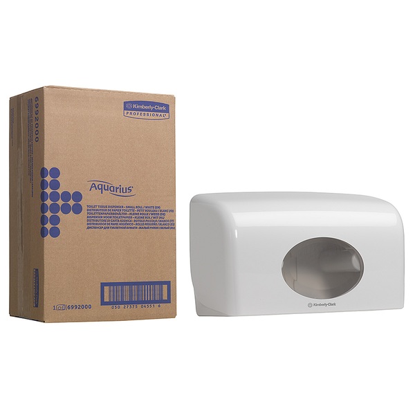Create a hygienic and coordinated washroom experience with the Aquarius dispenser range, designed to work in perfect harmony with the trusted and familiar Kleenex and Scott brands. These washroom dispensers are designed to support hygiene standards and deliver a consistent washroom solution suited to your workplace hygiene needs. For innovation and style, paired with exceptional performance, choose Aquarius small roll twin toilet roll dispenser. Part of a coordinated washroom range, this toilet tissue dispenser is designed to work in perfect harmony with Kleenex and Scott toilet tissue rolls. The double toilet roll dispenser offers an ideal solution where space is limited, helping to create a feeling of home away from home. With easy loading and hassle-free maintenance, it offers a smart, hygienic solution when you need it most and helps to keep costs down in areas of heavy use. Robust and lockable, this commercial toilet roll dispenser has a sleek and smooth rounded design with no dirt traps, allowing an easy, one-wipe-clean, promoting good washroom hygiene.This Kimberly-Clark dispenser is also available in black (code 7191) and is compatible with a variety of Kleenex and Scott toilet rolls, with 8484, 8475, 8538 particularly recommended. The toilet roll dispenser measures 18cm (L) x 29.8cm (W) x 12.8cm (D). 1 x Aquarius Twin Small Roll Toilet Tissue Dispenser – White