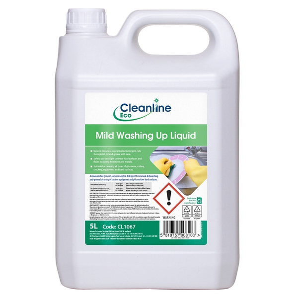 Cleanline Eco Mild Washing Up Liquid is a concentrated general-purpose neutral detergent for manual dishwashing and cleaning of kitchen equipment and pH sensitive hard surfaces.