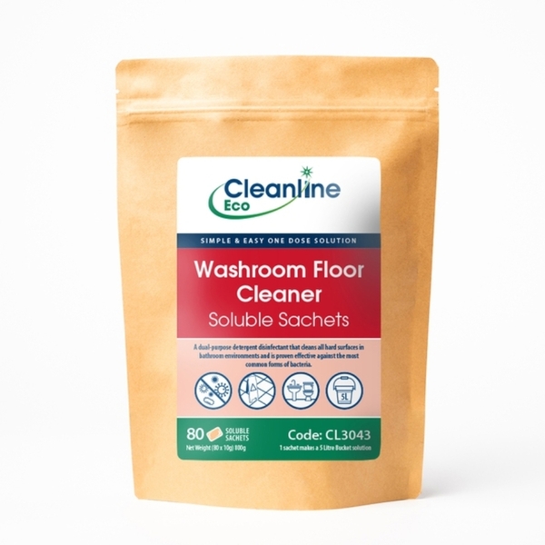 New Feature: New fast-dissolving paper sachets. Cleanline Eco Washroom Floor Cleaner soluble sachet is a dual-purpose detergent disinfectant, developed cut through grease and dried-on surface soiling.