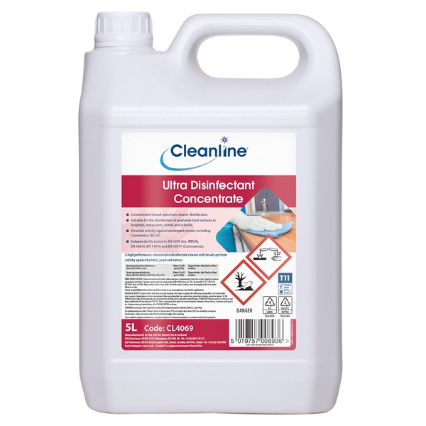 Cleanline Ultra Disinfectant Concentrate is a high performance virucidal cleaner disinfectant with broad-spectrum activity against bacteria, yeast and viruses and conforms to EN 14476, EN 16777 and EN 1276.