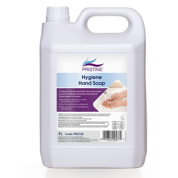 Enriched with moisturisers to gently and effectively clean your hands and leave them feeling soft. Dermatologically tested. Free from artificial colours and fragrances. Formulated to be highly effective against a wide range of bacteria and viruses. Ideal in environments where high standards of hygiene are essential, such as healthcare, kitchens and food preparation areas. The 5 litre bottle is ideal for refilling PRISTINE soap dispensers and 500ml pump bottle. Independently tested and certified to: BS EN 1276:2019, BS EN 1499:2013 and BS EN 14476:2013 + A2:2019 indicating the product is effective against enveloped viruses. 5 litre bottle made in the UK from 25% recycled HDPE. Use biocides safely. Always read the label and product information before use.