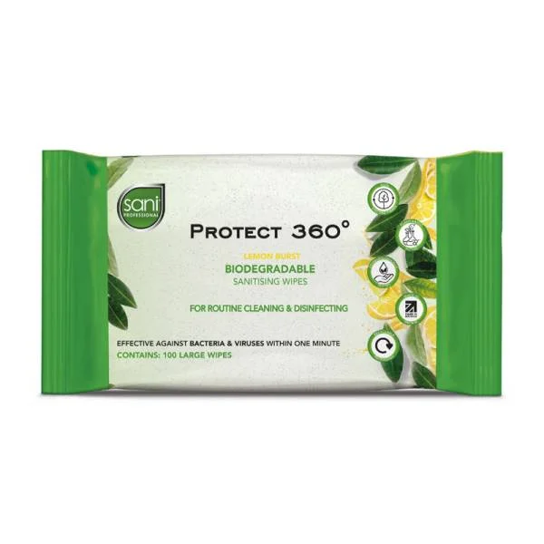 Sani Professional® Protect 360° Biodegradable Sanitising White Wipes | Lemon Scent | Pack of 100