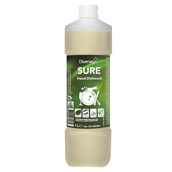 Concentrated hand dishwashing liquid for cleaning pots, pans, crockery, glass and all washable utensils.Part of the SURE range; plant-based, 100% biodegradable cleaning products designed to deliver superior professional results.Safe for people and kind to the environment.With environmentally-friendly ingredients from renewable resources, SURE products meet all your daily requirements for kitchens, facilities and personal care.