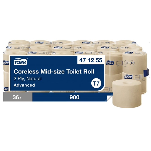 Tork Coreless Toilet Roll Natural T7: Washrooms with medium to high traffic can quickly get busy when toilet paper runs out. Our Tork Coreless Toilet Roll fits into a Twin Toilet Roll Dispenser to hold up to 4.5 times more paper than standard systems, helping you satisfy more guests throughout the day. The coreless design of this toilet roll also produces zero waste, improving both your sustainability and reputation. The light brown colour comes from using recycled cardboard boxes as one of the fibre sources. No dyes are added in the paper-making. Plus, its Tork Easy Handling Plastic Bag ensures easy carrying, opening and disposing of packaging to boost staff efficiency.Advantages at a glance: Compatible closed dispenser for better hygiene. High-capacity dispenser for less refilling. Coreless toilet paper for zero waste. Tork Easy Handling Plastic Bag for simple package handling. Satisfy guests in medium- to high-traffic washrooms. Sustainable refills in a light brown colour.